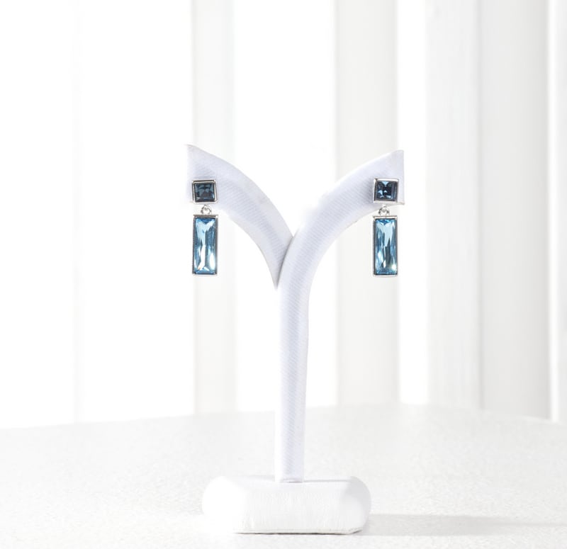 深みのあるブルーのクリスタルが、光を受けるたびに奥行きのある輝きを放ち、耳元に知性と落ち着きを添えます。